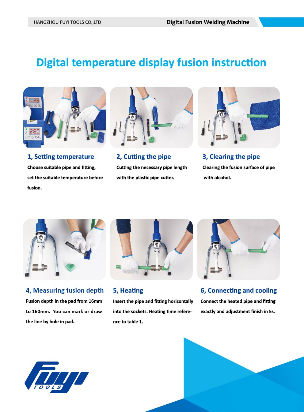 디지털 소켓 융합 용접기 사용 방법 1. 온도 설정 적절한 파이프 및 피팅을 선택하고 적절한 온도를 설정하십시오. 2. 파이프 절단 플라스틱 파이프 절단기를 사용하여 필요한 파이프 길이를 절단합니다. 3. 배관 청소 알코올로 배관 융착면 청소 4. 융합 깊이 측정 패드의 융합 깊이는 16mm에서 160mm입니다. 패드의 구멍으로 선을 표시하거나 그릴 수 있습니다. 5. 가열 파이프와 피팅을 소켓에 수평으로 삽입합니다. 키트에 들어 있는 설명서를 참조하여 가열 시간을 확인하세요. 6. 연결 및 냉각 히팅파이프와 피팅을 정확하게 연결하고 5초만에 마감을 조정합니다.